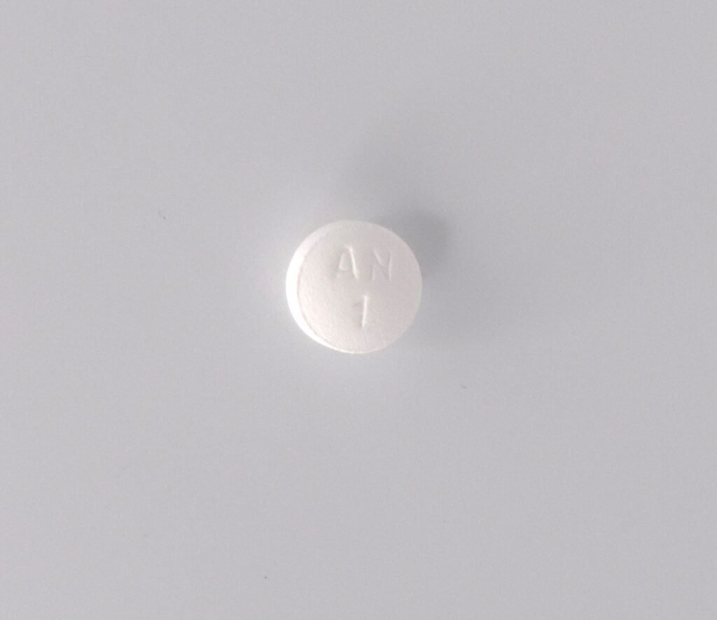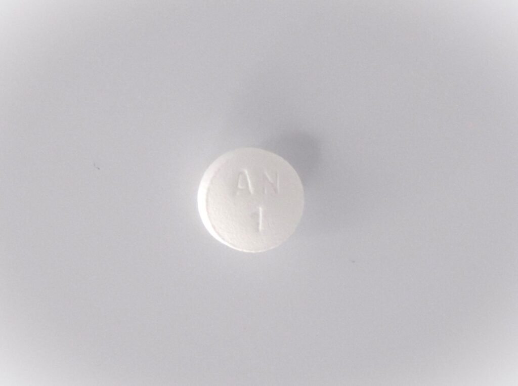 White, round, film-coated tablet, debossed with “AN” and “1” on one side.