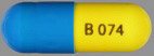 Capsule with blue opaque cap with yellow opaque body imprinted with “B 074” in black ink.
