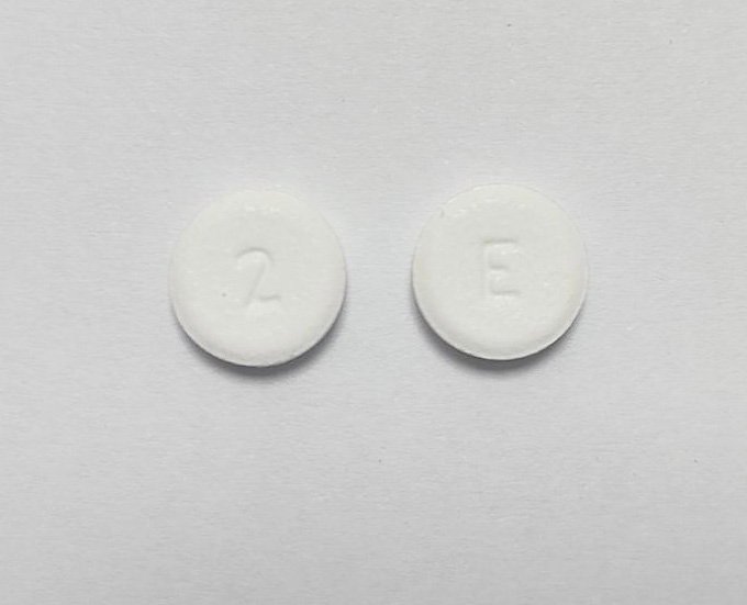 White to off white colored, round, flat tablets, debossed with “2” on one side and “E” on other side