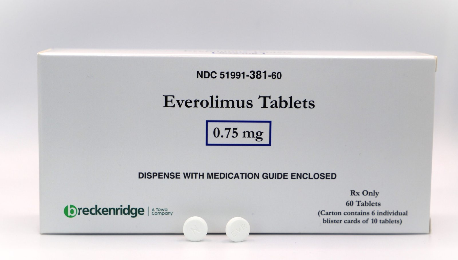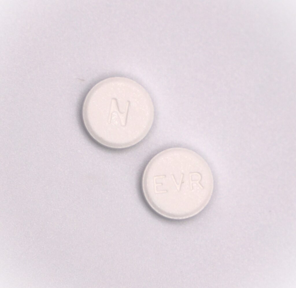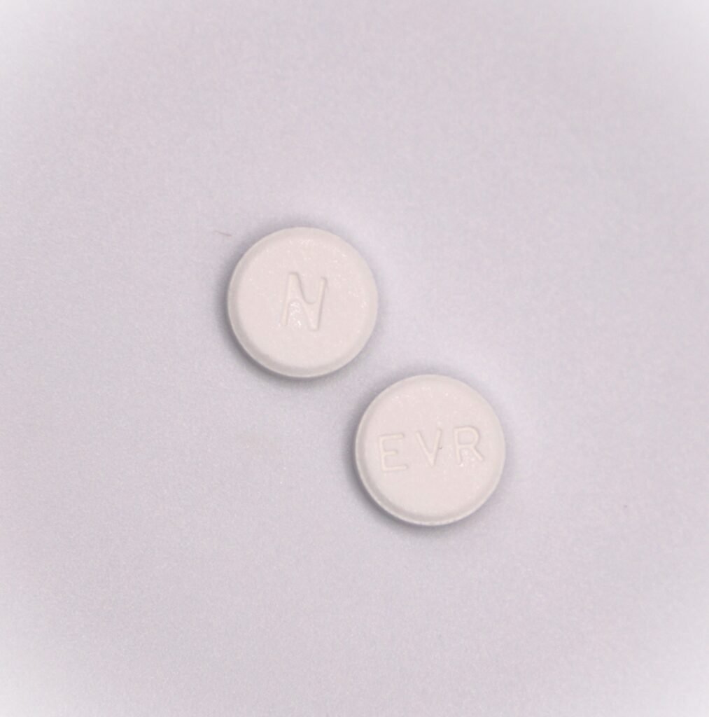 Each strength is available in boxes of 60 tablets (6 blister strips of 10 tablets each) and bottles of 60 tablets. White to off white colored, round, flat shaped tablet ‘EVR’ on one side and ‘N’ on the other side.