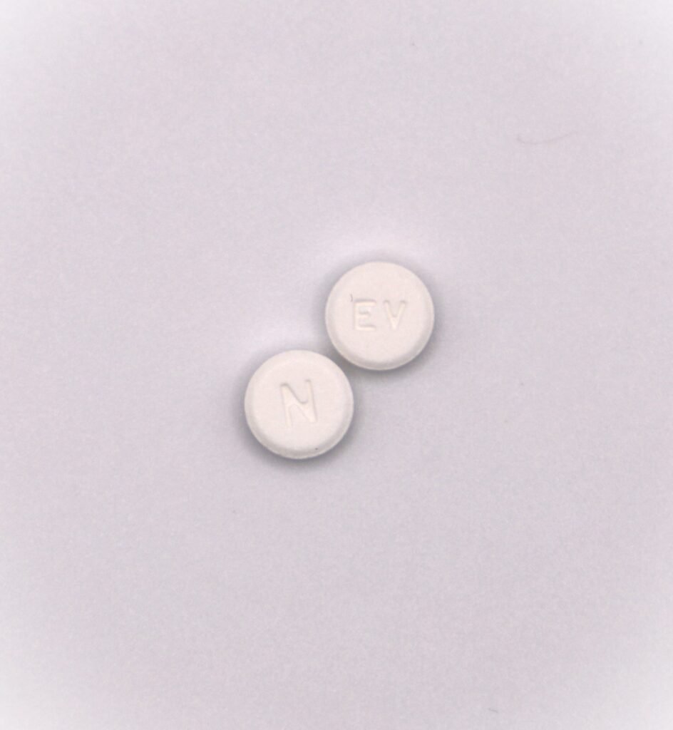 Each strength is available in boxes of 60 tablets (6 blister strips of 10 tablets each) and bottles of 60 tablets. White to off white colored, round, flat shaped tablet ‘EV’ on one side and ‘N’ on the other side.