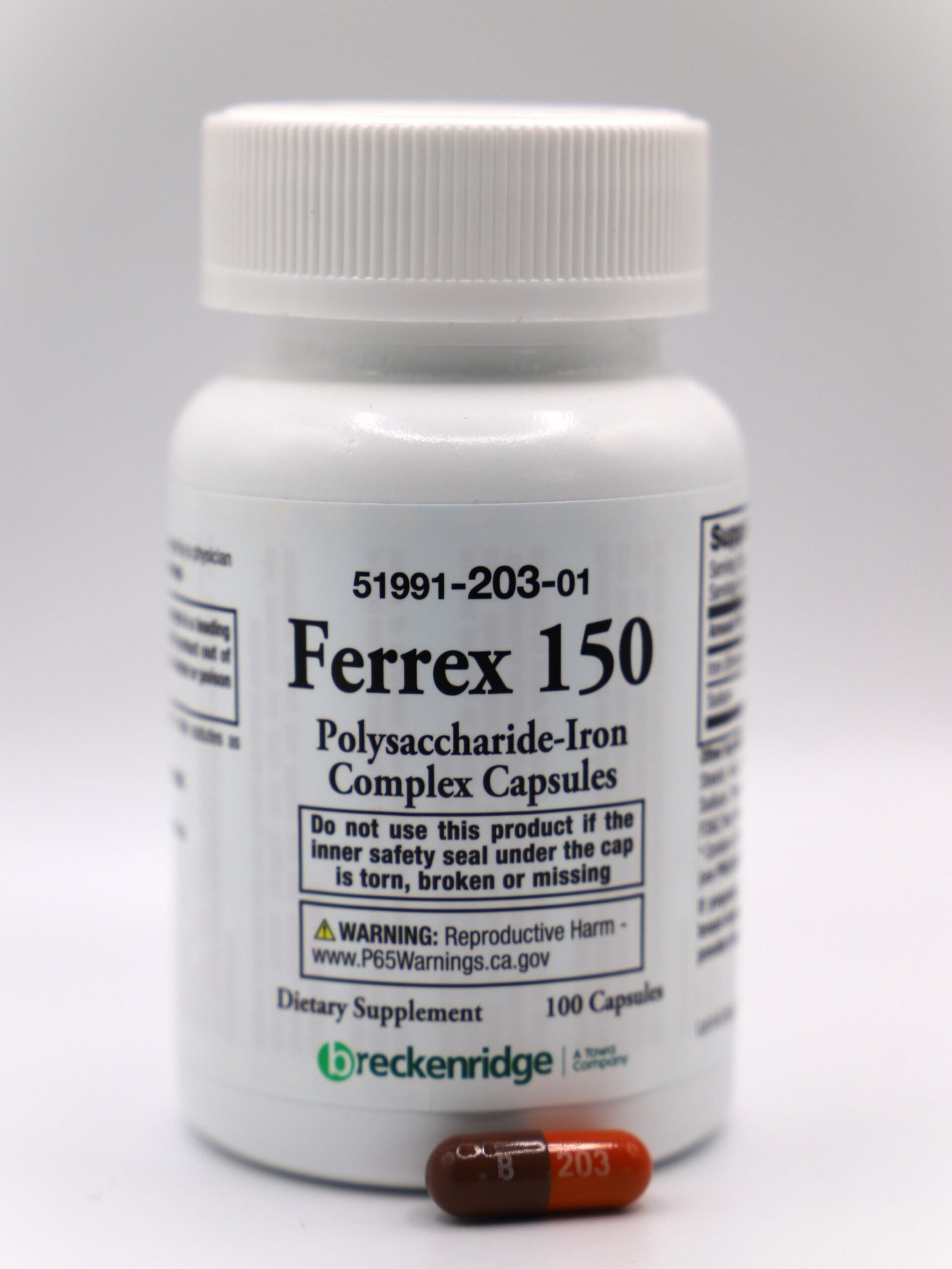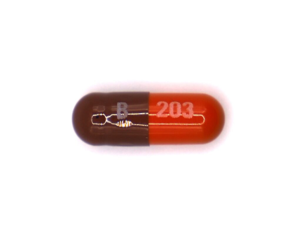 Orange/brown capsule, imprinted “B203”