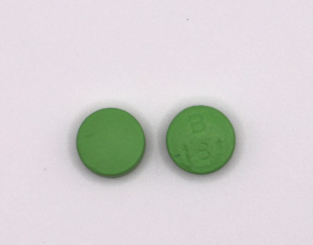 Round,green, film-coated tablet debossed “B181”.