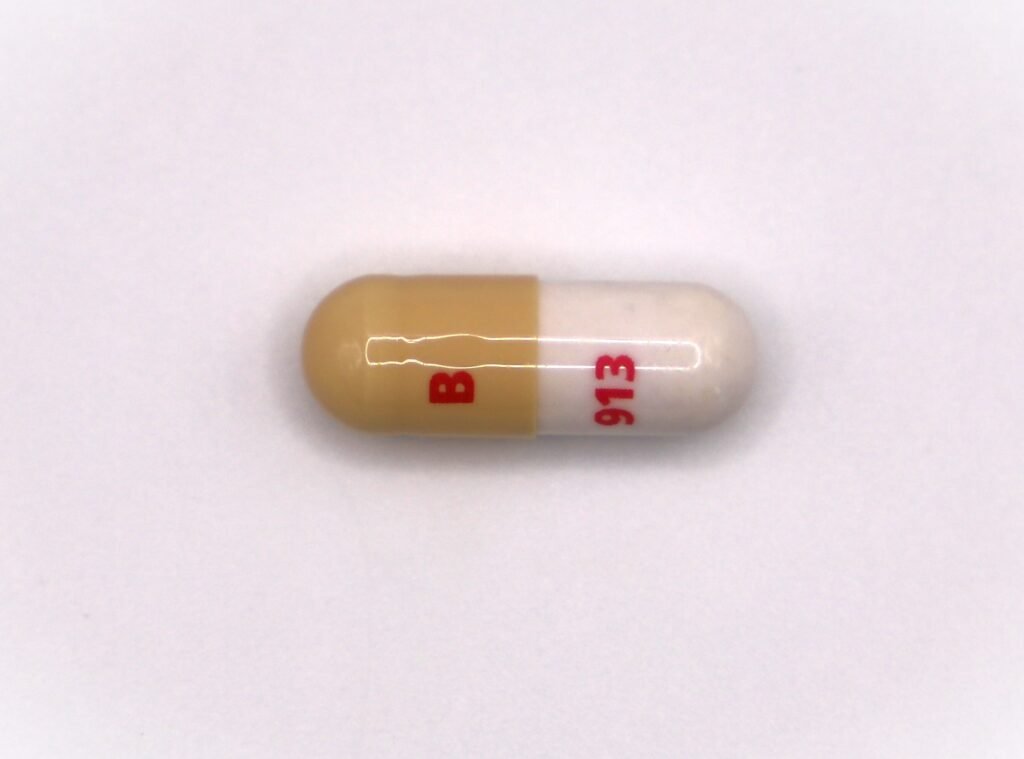 Caramel Cap and Opaque White Body, Imprinted B in red ink on the cap and 913 in red ink on the body.