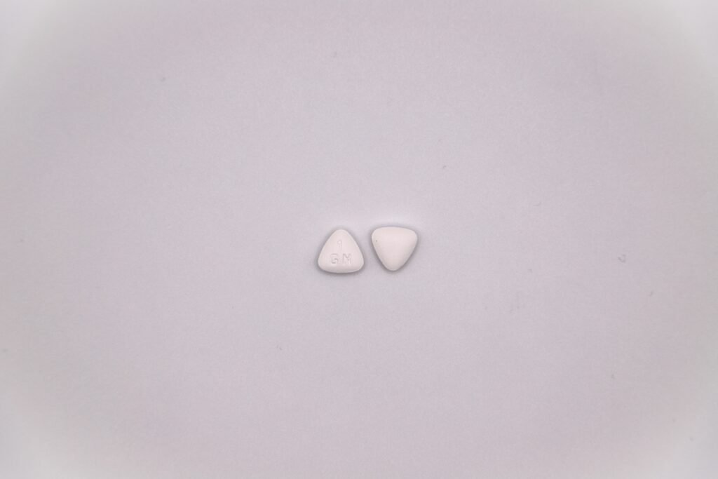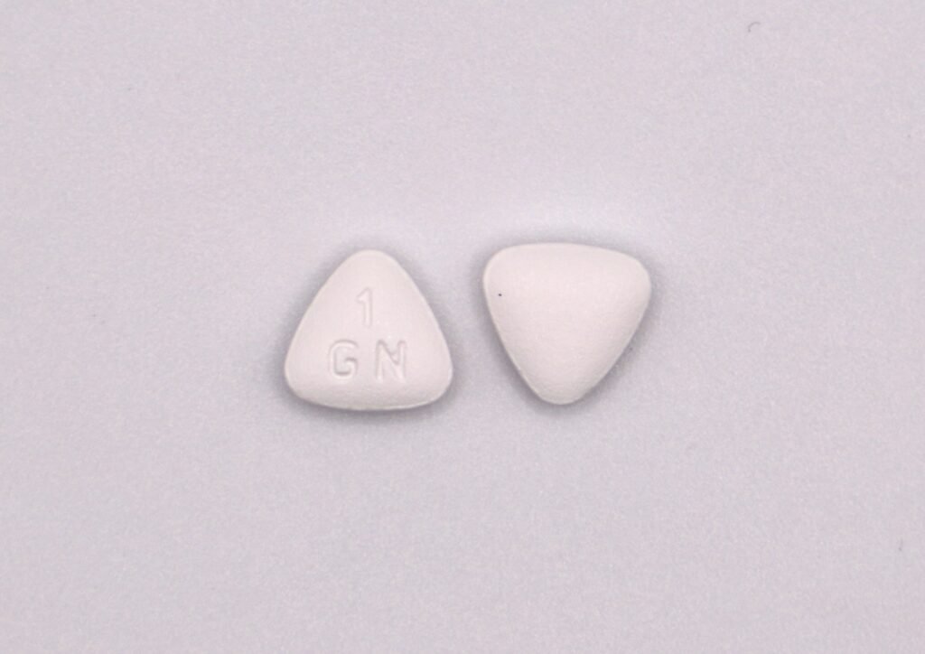 White, triangular, biconvex, film-coated tablet with debossing of ‘1GN’ on one side.