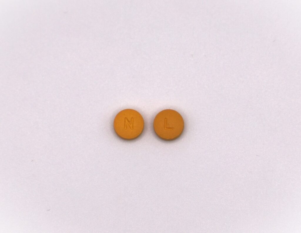Yellow, film-coated, round tablet, debossed “N” on one side and “L” on the other side.