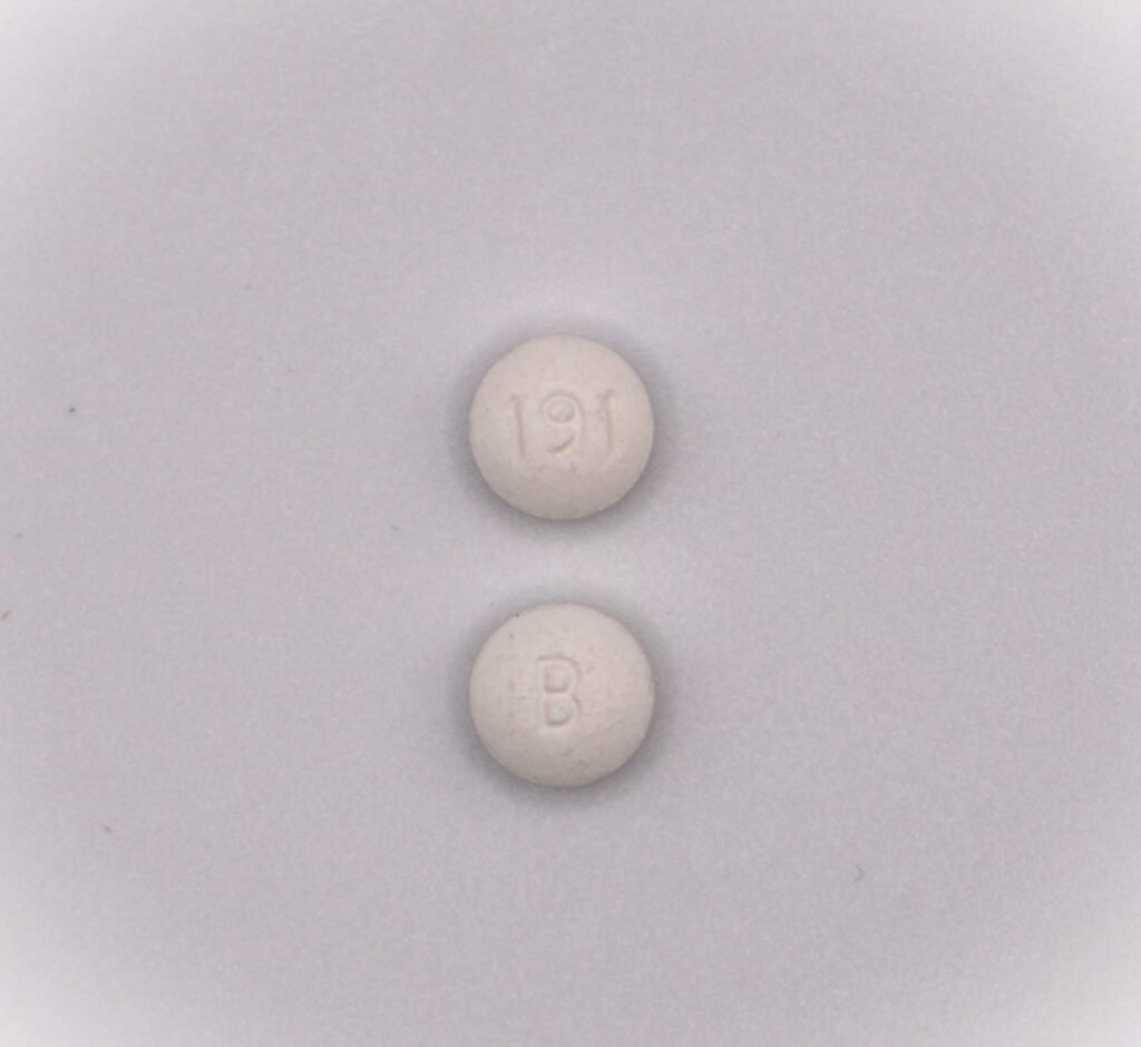 White, round tablet, debossed “B” on one side and “191” on the other side.