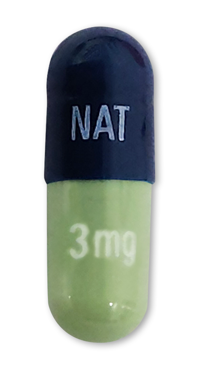 Dark blue cap and green body printed with “NAT” with white ink on cap and “3mg” with white ink on body of the capsule